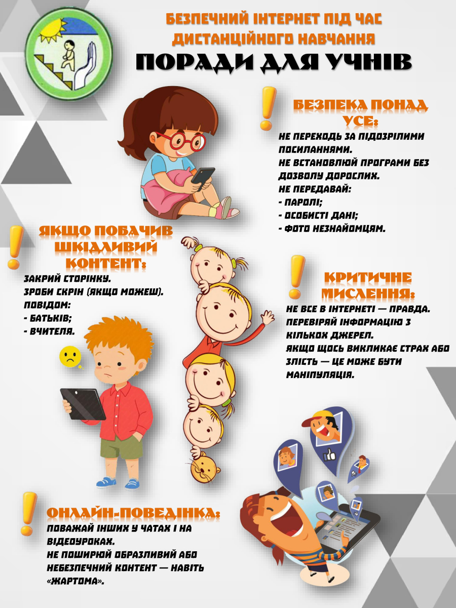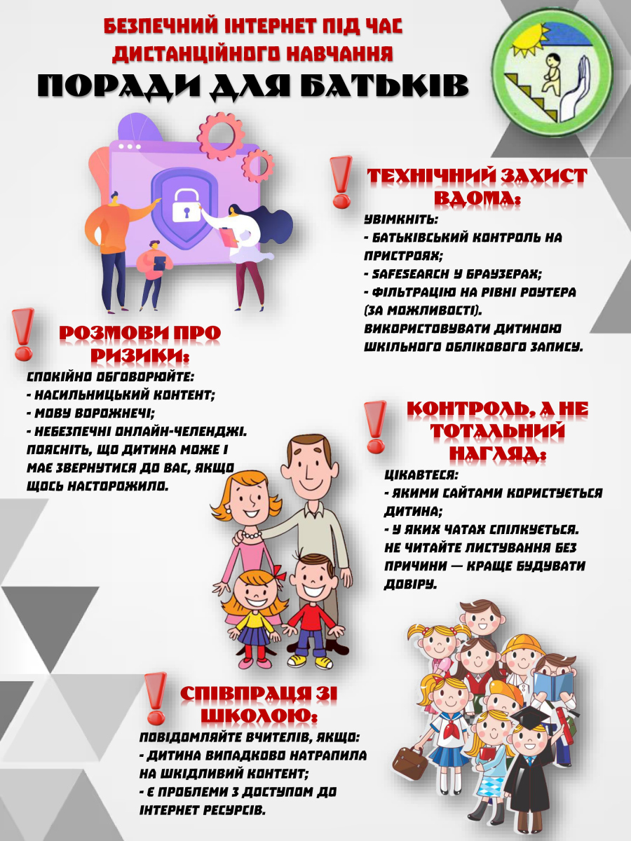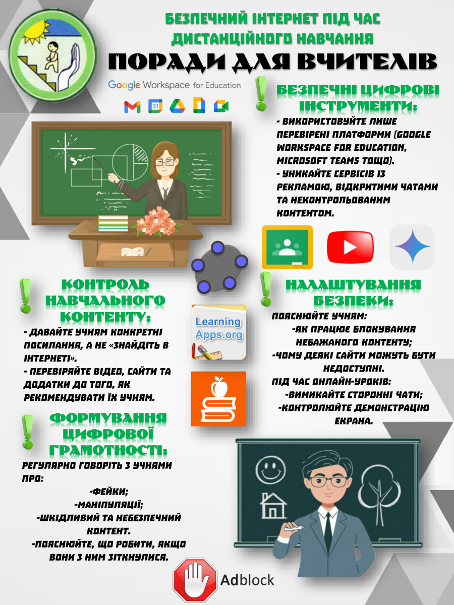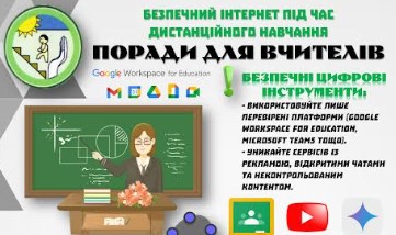 Учитель Дмитро Кривошеєнко розробив пам’ятки «Безпечний інтернет під час дистанційного навчання. Поради для учнів, батьків, учителів». Матеріали були опрацьовані з учнями та їхніми родинами й системно використовуються в освітньому процесі.