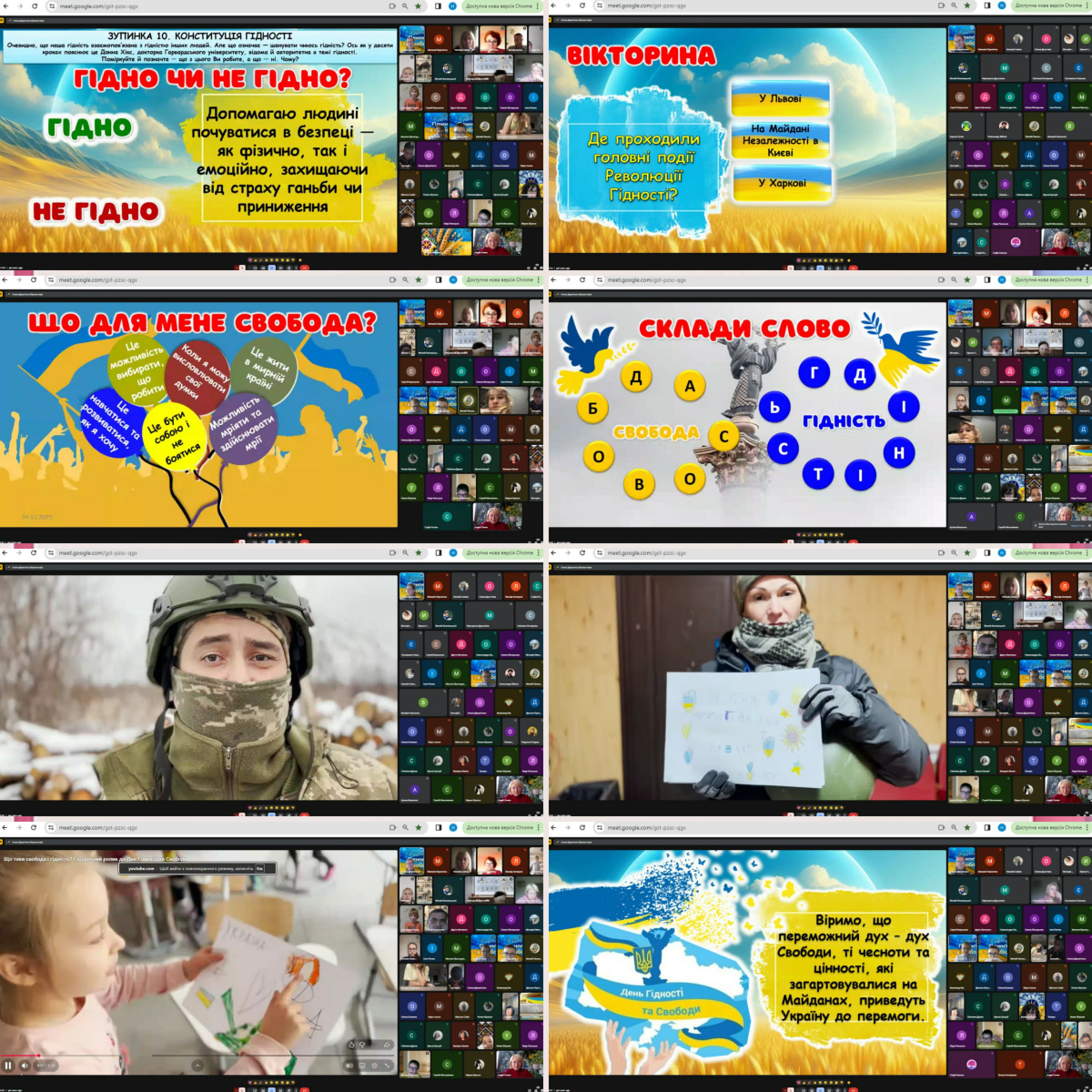 Програма заходу включала інтерактивні завдання, тематичну вікторину в рамках участі у Всесвітньому Дні Гідності – 2025. Учні створили «хмаринку гідності та свободи», поділилися власними історіями про гідність, визначили важливі принципи, які роблять людину стійкою та сильнішою, склали «Конституцію Гідності», виконали «Руханку Гідності», обговорили життєві ситуації, у яких важливо залишатися чесним і сміливим, та сформулювали добрі побажання для України й один одного.