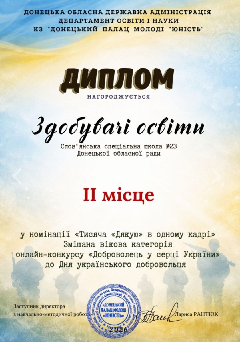 Щиро вітаємо здобувачів освіти з почесним ІІ місцем в онлайн-конкурсі «Доброволець у серці України» у номінації відеопривітань «Тисяча «Дякую» в одному кадрі», організованому КЗ «Донецький Палац молоді «Юність» до Дня українського добровольця.