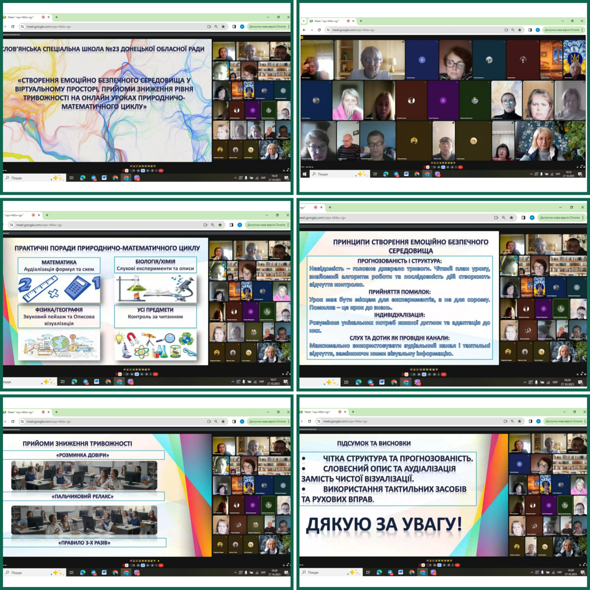 Керівник методичного об’єднання педагогів природничо-математичного циклу Дмитро Кривошеєнко представив виступ на тему «Створення емоційно безпечного середовища у віртуальному просторі, прийоми зниження рівня тривожності на онлайн-уроках в умовах воєнного стану», під час якого розкрив принципи побудови довірливого освітнього простору, запропонував низку ефективних прийомів – «Розминка довіри», «Пальчиковий релакс» та «Правило 3-х разів» – та надав методичні рекомендації для вчителів природничо-математичного циклу щодо інтеграції коротких психоемоційних практик в освітній процес.