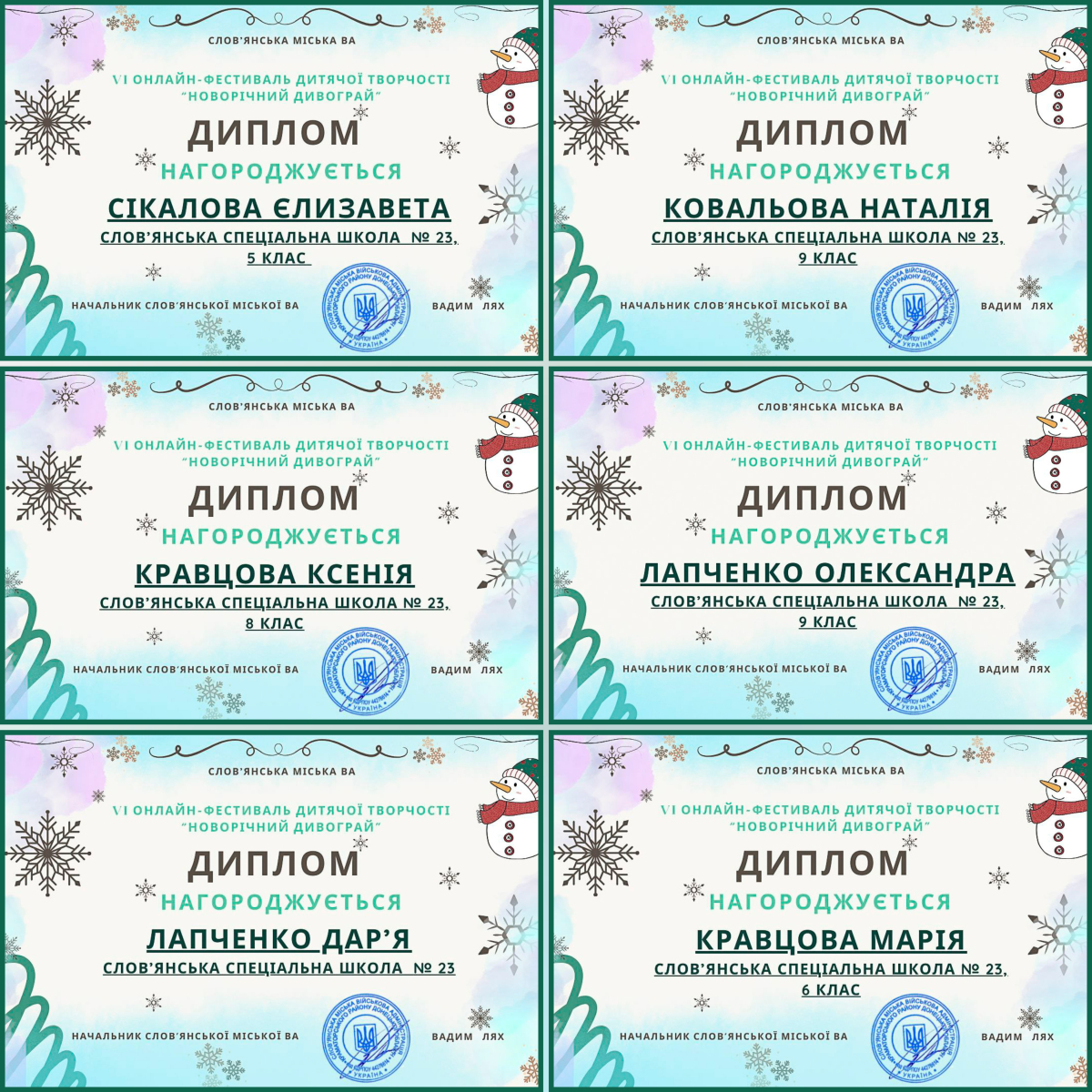 Наші учні представили новорічні пісні, малюнки та вироби декоративно-ужиткового мистецтва, продемонструвавши креативність, старанність і святковий настрій. Підсумки фестивалю було підбито 30 грудня: усі учасники отримали дипломи від Слов’янської міської військової адміністрації та солодкі подарунки.