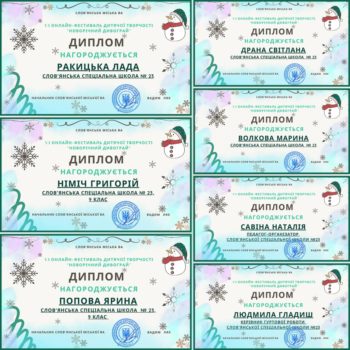 Здобувачі освіти Слов’янської спеціальної школи № 23 Донецької обласної ради долучилися до онлайн-фестивалю дитячої творчості «Новорічний дивограй», який об’єднав юних митців напередодні зимових свят.
