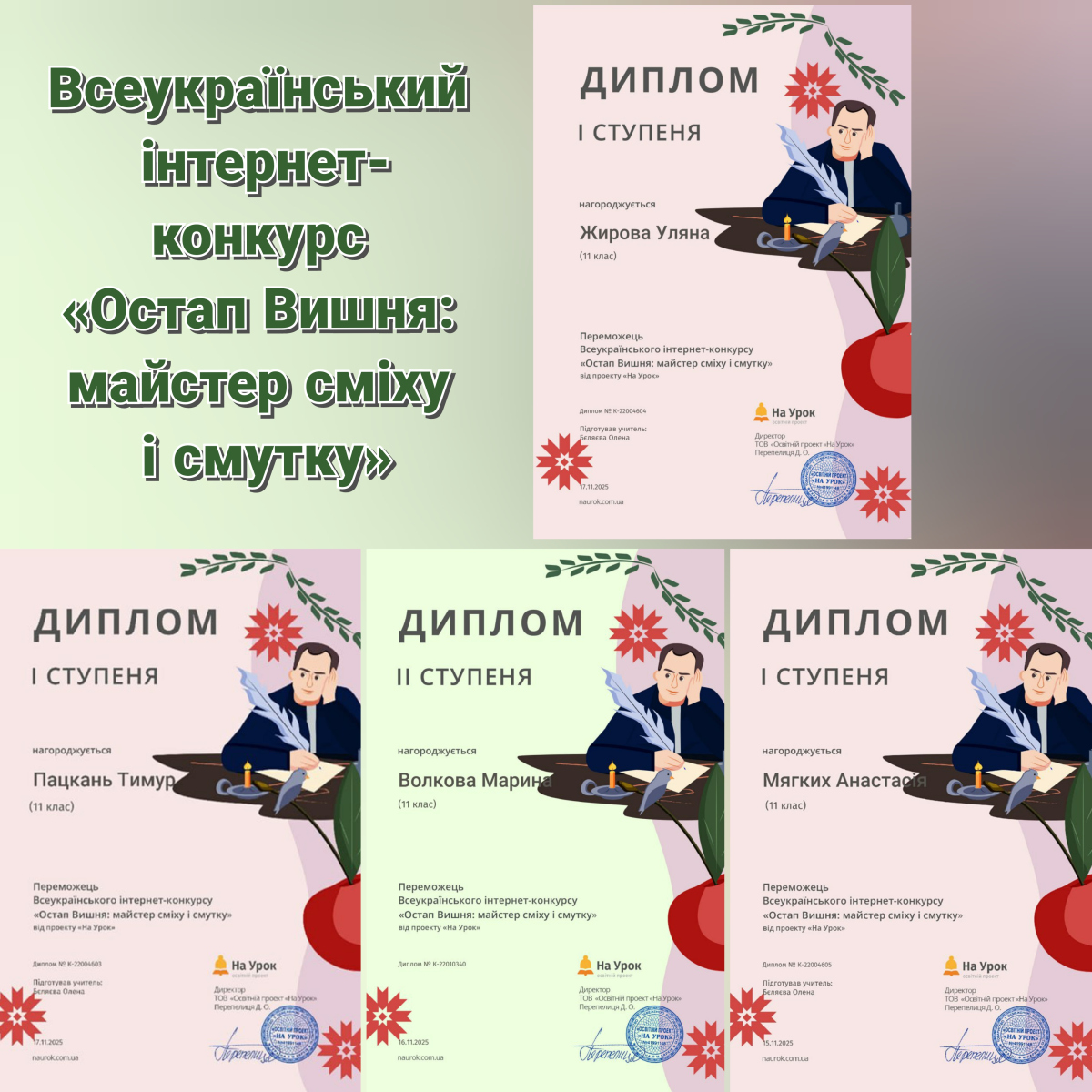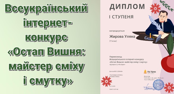 Учні й учениці 12-А класу під наставництвом учителя української мови та літератури Олени Бєляєвої взяли участь у Всеукраїнському інтернет-конкурсі «Остап Вишня: майстер сміху і смутку». Своїми результатами вони продемонстрували стійкі знання та глибоку ерудицію про життєвий і творчий шлях письменника, підтвердивши високий рівень підготовки. Отримані дипломи учасників й учасниць інтернет-конкурсу є яскравим підтвердженням їхньої наполегливості та доказом того, що українська класична література продовжує надихати нові покоління.