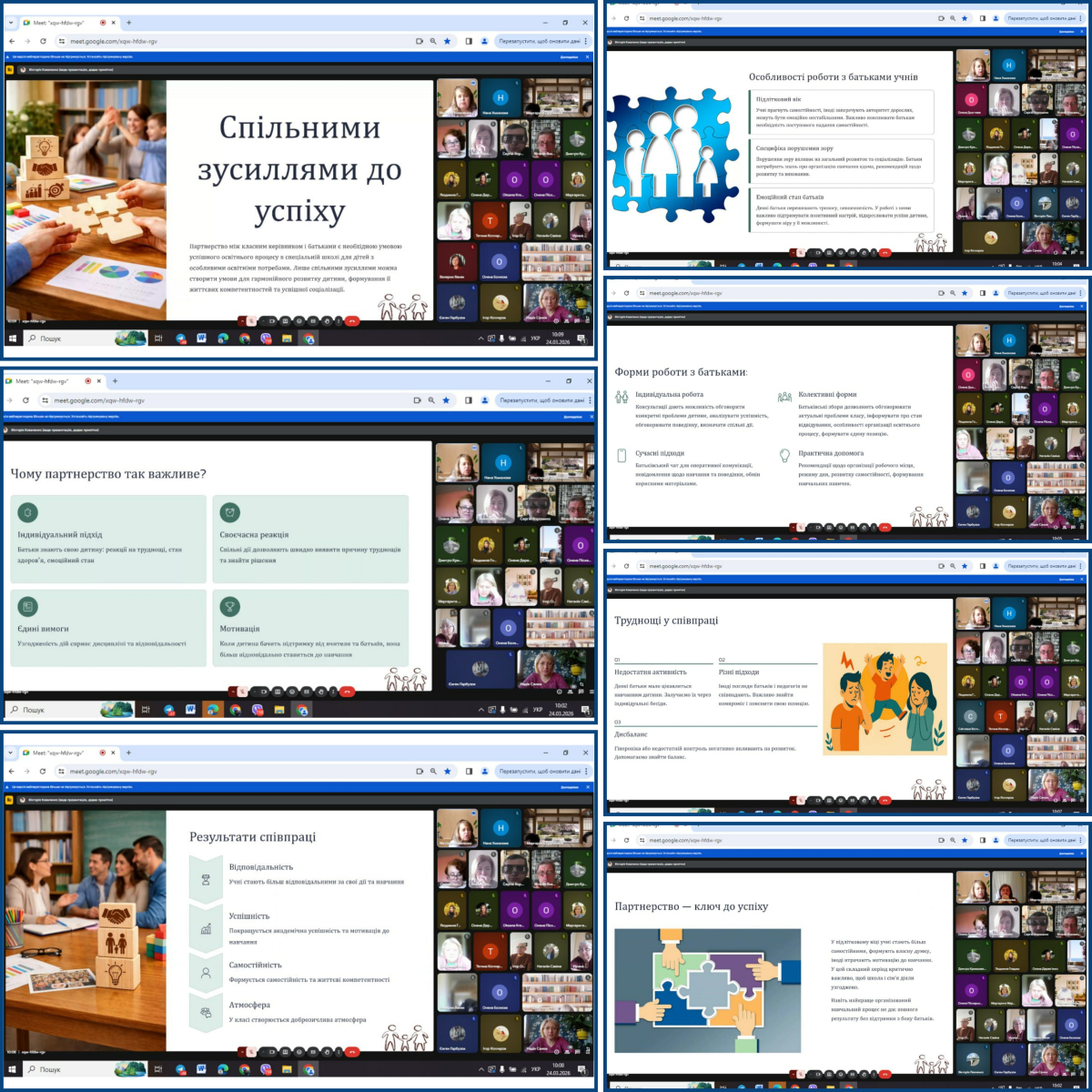 У межах засідання Вікторія Коваленко детально розкрила роль партнерства з батьками як фундаменту ефективного освітнього процесу. Педагог наголосила на важливості глибокого розуміння особливостей співпраці з родинами дітей, які потребують спеціальних умов навчання. Вікторія Коваленко висвітлила сучасні форми взаємодії, що допомагають подолати комунікативні бар’єри та технічні складнощі дистанційного формату. Основною ідеєю виступу стало переконання, що лише спільними зусиллями педагогів і батьків можна досягти успіху в навчанні та розвитку дитини.