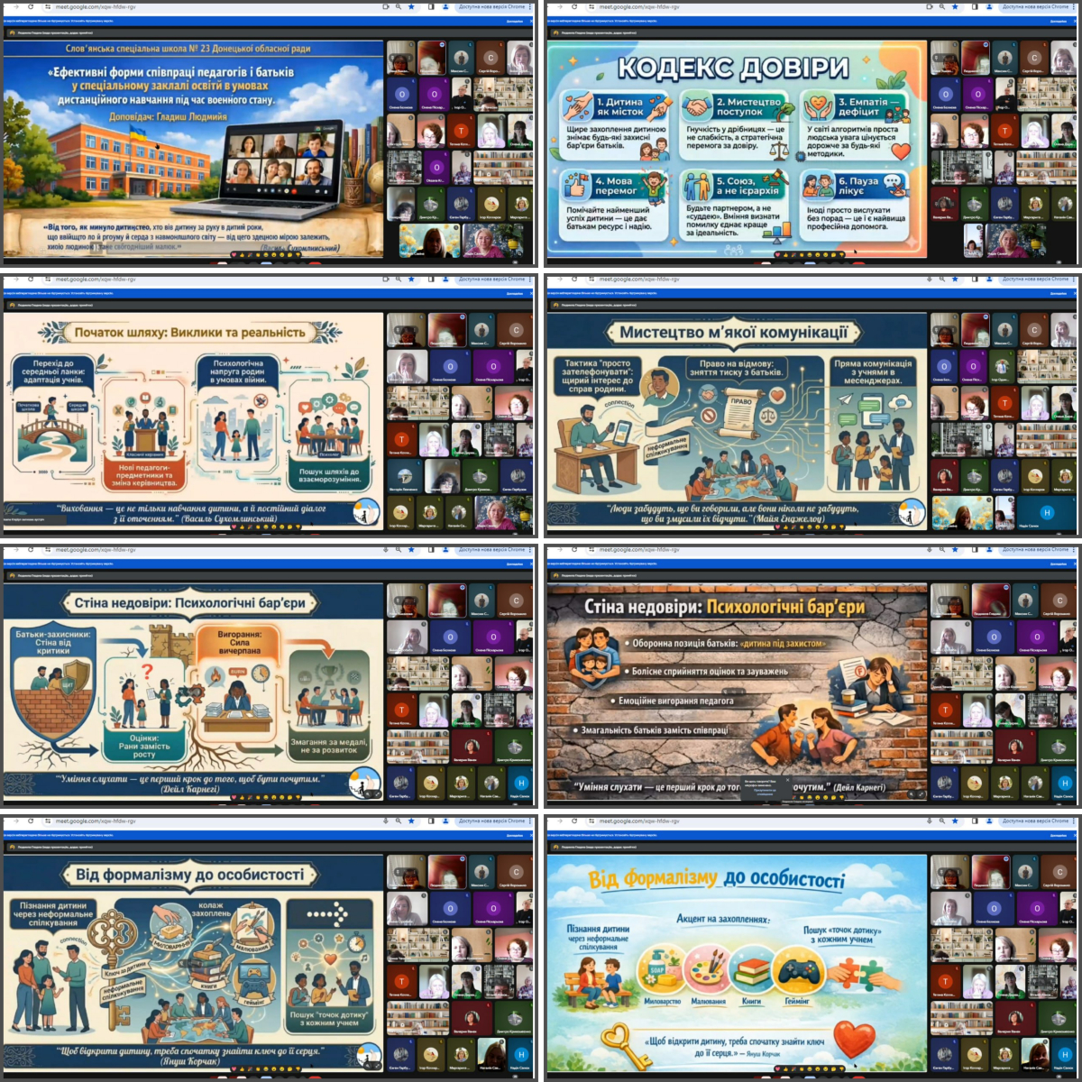У доповіді Людмили Гладиш було представлено ефективні форми співпраці педагогів і батьків у спеціальному закладі освіти в умовах дистанційного навчання під час воєнного стану. Вона поділилася власним досвідом організації взаємодії у класному колективі, акцентуючи увагу на побудові «Трикутника успішної взаємодії», де школа, діти та батьки діють як єдиний злагоджений механізм. Серед ключових складових такої співпраці було визначено «Кодекс довіри» як основу відкритих і чесних відносин, перехід від формального підходу до особистісно орієнтованого, «мистецтво м’якої комунікації», що передбачає доброзичливе та підтримувальне спілкування, а також усвідомлення того, що навчання є спільною відповідальністю учасників освітнього процесу. Представлений досвід засвідчив, що така модель взаємодії сприяє підвищенню навчальної мотивації учнів і створенню комфортного освітнього середовища навіть у складних умовах.