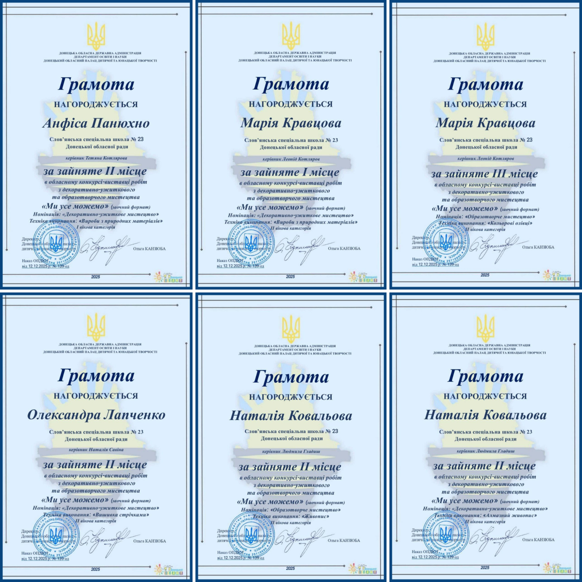- Кравцова Ксенія, номінація «Декоративно-ужиткове мистецтво», техніка виконання «Вироби з природних матеріалів» – І місце;