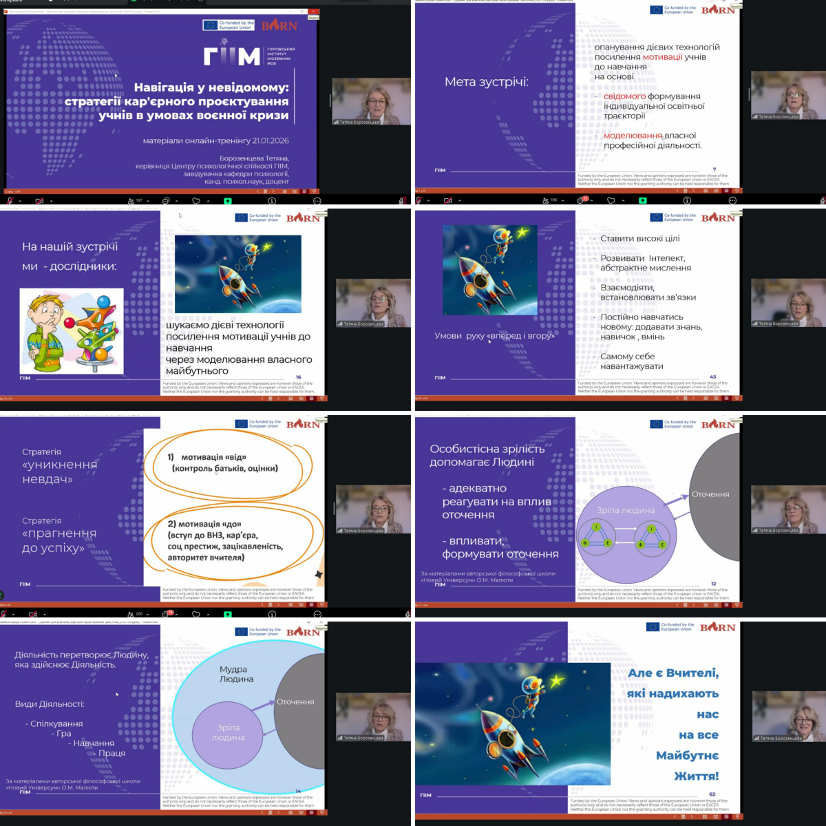 У межах системної профорієнтаційної роботи з учнівством  заступник директора з виховної роботи Салюк Н.І. та класні керівники 9-12 класів Коваленко В.Л., Піскарьова О.Є., Бєляєва О.О. взяли участь в онлайн-тренінгу «Навігація у невідомому: стратегії кар’єрного проєктування учнів в умовах воєнної кризи», який відбувся 21 січня 2026 року в онлайн-форматі.