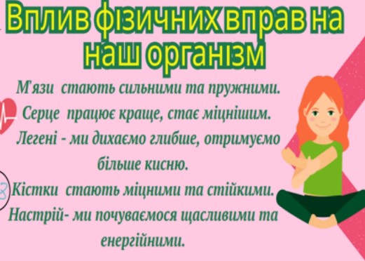 Учні дослідили, як вправи зміцнюють м’язи, роблять тіло витривалішим, допомагають формувати правильну поставу, покращують роботу серця, розвивають гнучкість і зміцнюють імунітет.