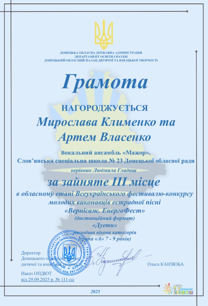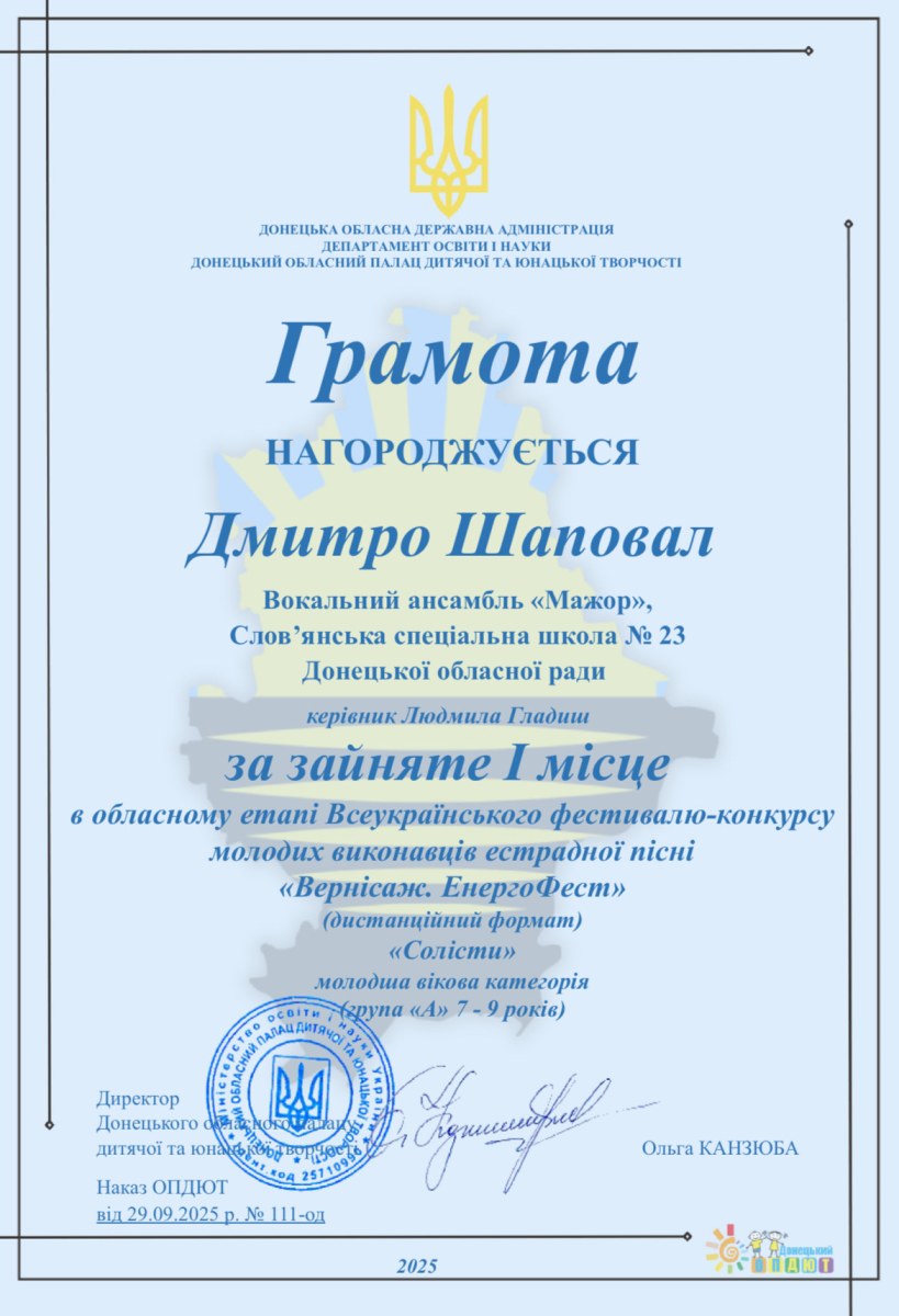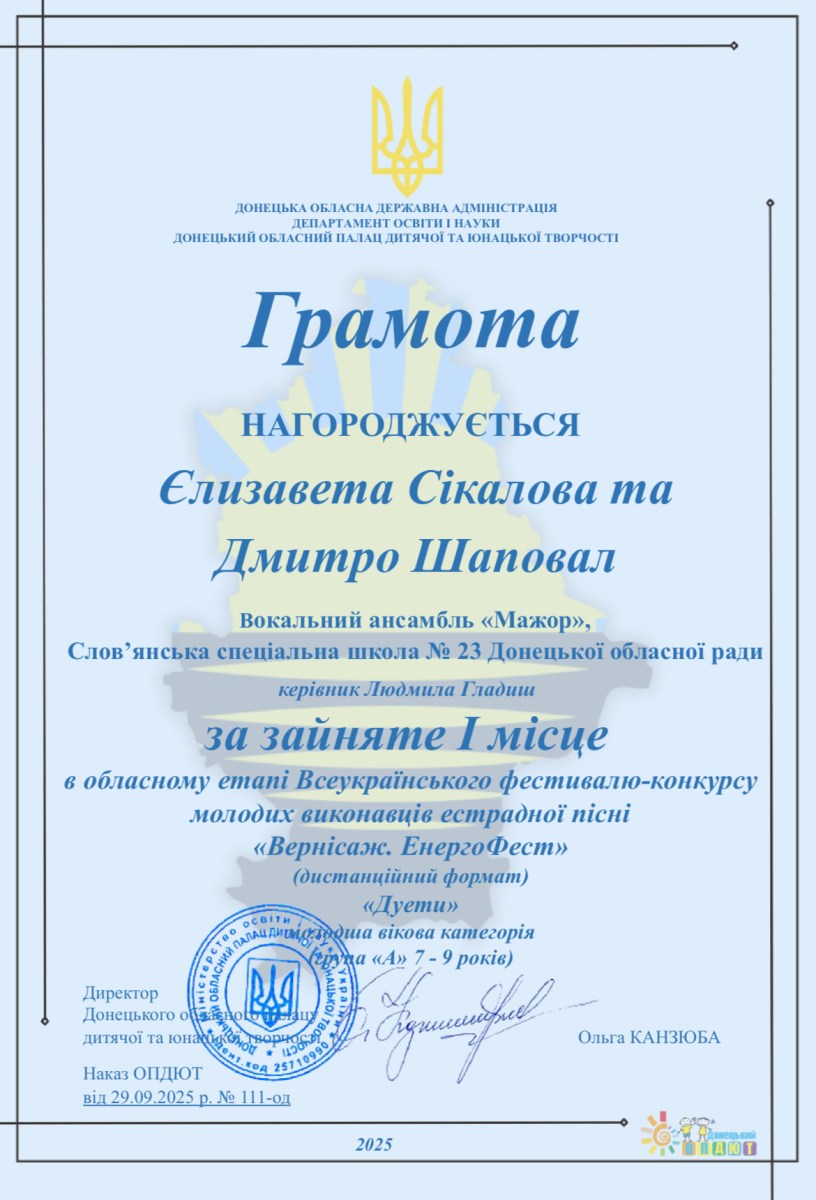 Вітаємо наших обдарованих учнів та їх натхненну наставницю Людмилу Гладиш із блискучою перемогою на обласному етапі Всеукраїнського фестивалю-конкурсу молодих виконавців естрадної пісні «Вернісаж. ЕнергоФест».