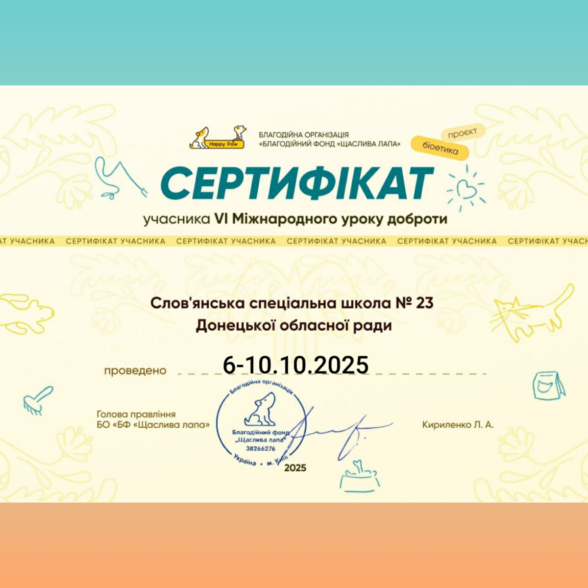 Наш освітній заклад традиційно отримав електронний сертифікат учасника Міжнародного уроку доброти, що проходив з 6 по 10 жовтня 2025 року.